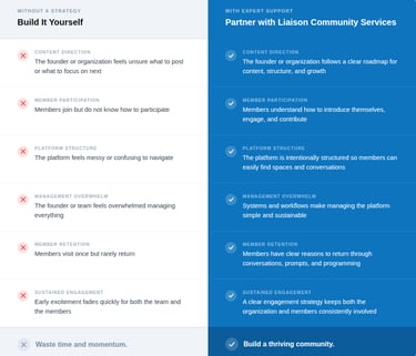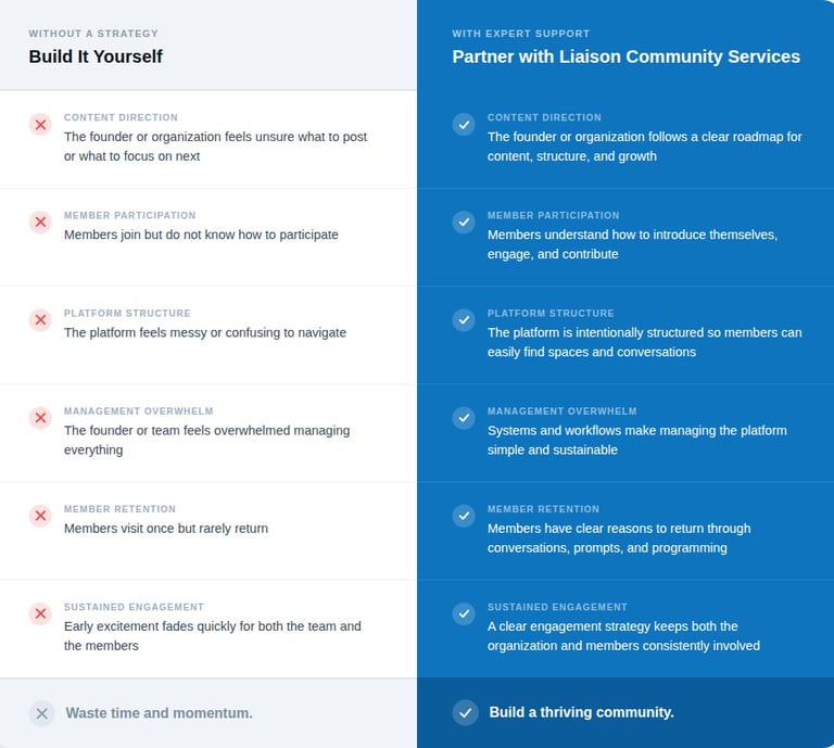 For the founder or organization ready to go "We handle the heavy lifting so you don't have to. From platform setup to launch day, we build your community the right way from the start.